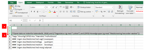 For at kunne arbejde med dataudtrækket i Excel skal de tre rækker fjernes. Man kan evt. kopiere rækken med søgekriterier til et andet ark, så man på et senere tidspunkt kan huske eller genskabe søgekriterierne for dataudtrækket.
