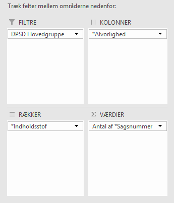 Du kan trække de variabler, du ønsker at kigge nærmere på, ned i de øvrige bokse. Hvis du fx vil se hændelserne fordelt på alvorlighed og Indholdsstof, kan du trække de to variabler ned i boksene for hhv. Kolonner og Rækker.