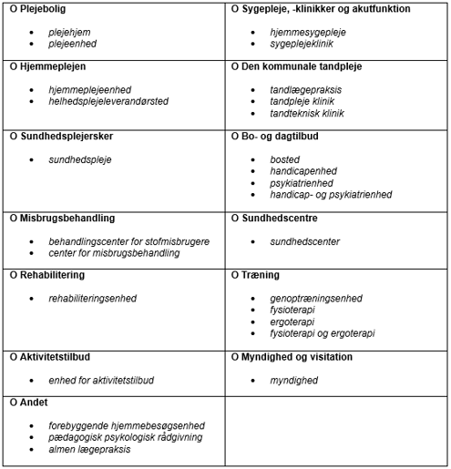Enhedstyperne er angivet i kursiv – disse er ikke synlige i lokationsopslaget, det er kun overskrifterne markeret med fed. Når et behandlingssted registreres i SOR, skal det samtidig have en enhedstype tilknyttet. Det er denne registrering, som afgør, hvilken overskrift/prik behandlingsstedet bliver vist under i lokationsopslaget.